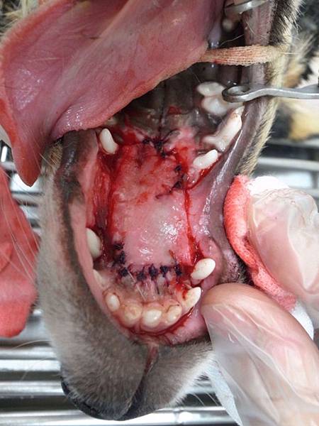 將左右兩邊的顎裂拉緊縫合,後因為張力過大導致組織崩壞。