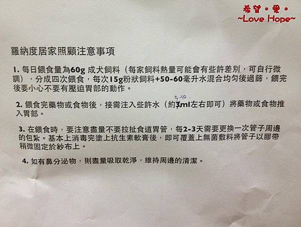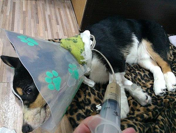 食道胃管餵食。食道胃管照顧方式後來向有相同狀況的毛孩子馬爾弟弟請教。