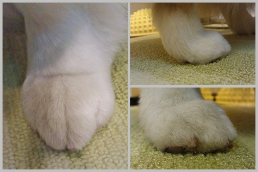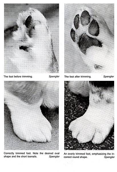 上圖左:過長的足底毛;上圖右:經過修剪的足底毛。下圖左:經過修剪成橢圓型及短趾甲;下圖右:趾縫間的毛過度修剪呈現不正確的圓型。