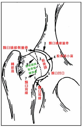 八、Junction of femoral head and neck(股骨頭與股骨頸連接處) – 此處的顯影可幫助評估股骨頸的大小、形狀與股骨頸/頭的構造。一個發育不全的髖關節,其最早也最常因受到影響而產生退化性變化的地方,就是髖關節球的頸部。